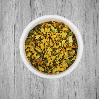 Løg, salt, gurkemeje, bukkehorn, peber, paprika, persille, koriander, spidskommen, dildfrø, ingefær, krydderi- og krydderurteekstrakter/HVEDE (chili, koriander, hvidløg, kardemomme, muskat, salvie), HVEDE stivelse, sukker, antiklumpningsmiddel: E551